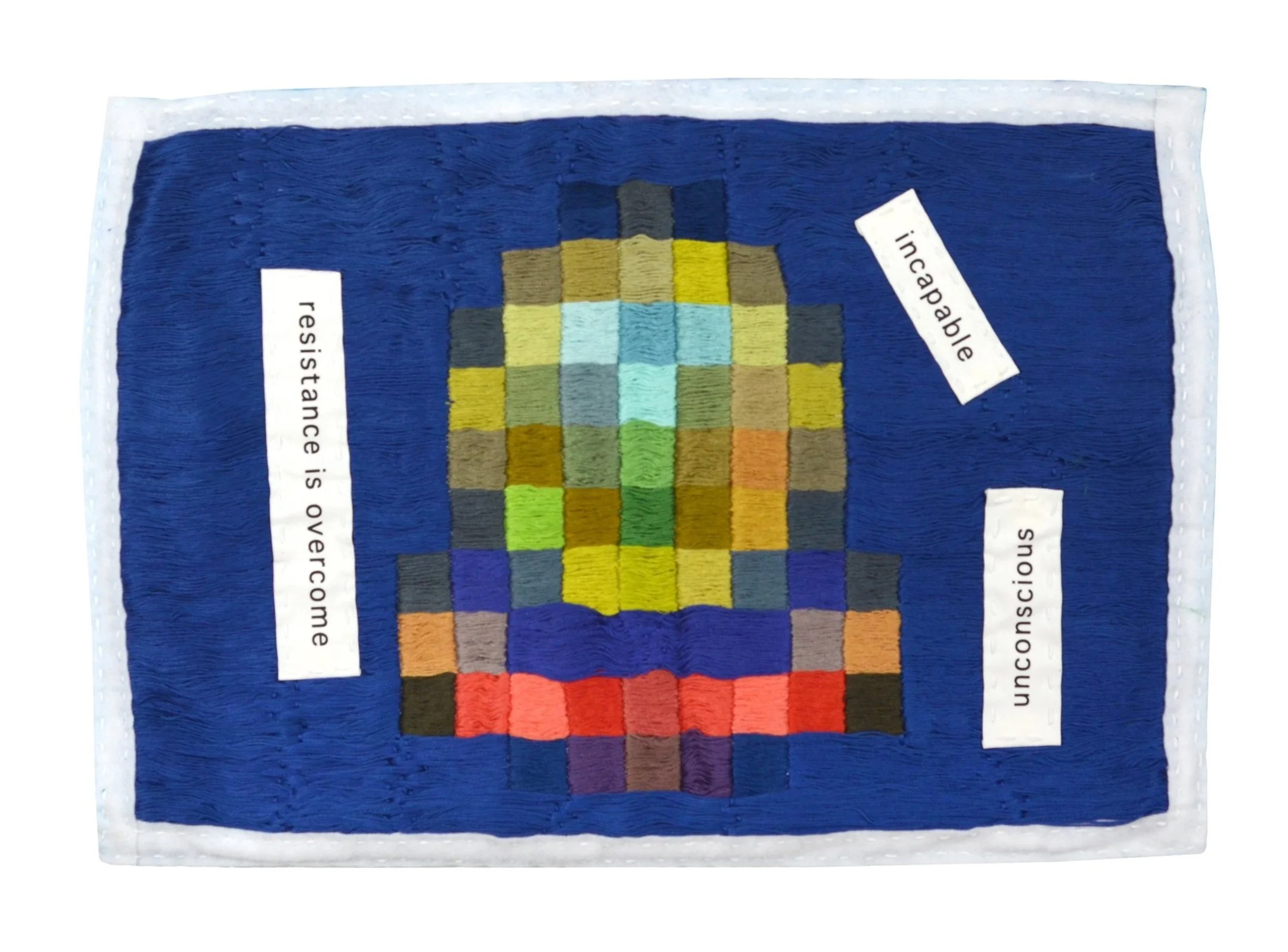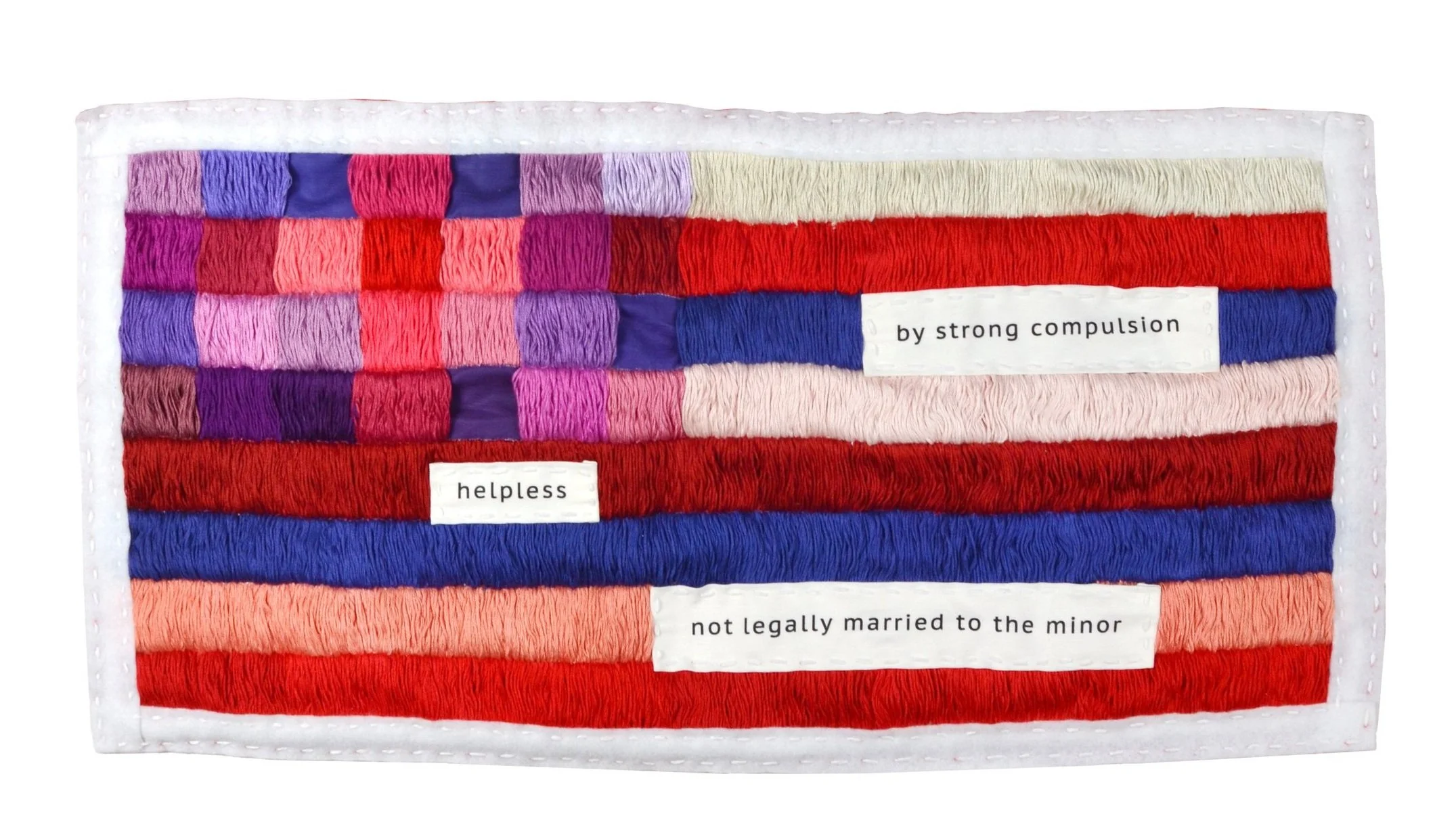 USOR or "United States of Rape" is a research-based series of hand-embroidered flags representing each state and its laws on rape and sexual assault. The laws are taken out of context, mixed up, and displayed over a pixelated version of the state flag. The words and phrases extracted from these laws, using RAINN as a resource, are significant to Curtis because they are either shocking, confusing, or notably different from other state laws. Currently, each state in the United States has varying laws regarding rape, sexual assault, and sexual violence. Some laws are comprehensive, while others consist of just three sentences. Some states define rape as only possible between a man and a woman, while others break their laws into multiple degrees and even define sexual consent. As a survivor of sexual assault and intimate partner violence, Curtis was shocked to discover that laws regarding sexual assault and rape can vary greatly from state to state. When victims of sexual violence seek justice through the legal system, they may be unaware of how their state defines these crimes.